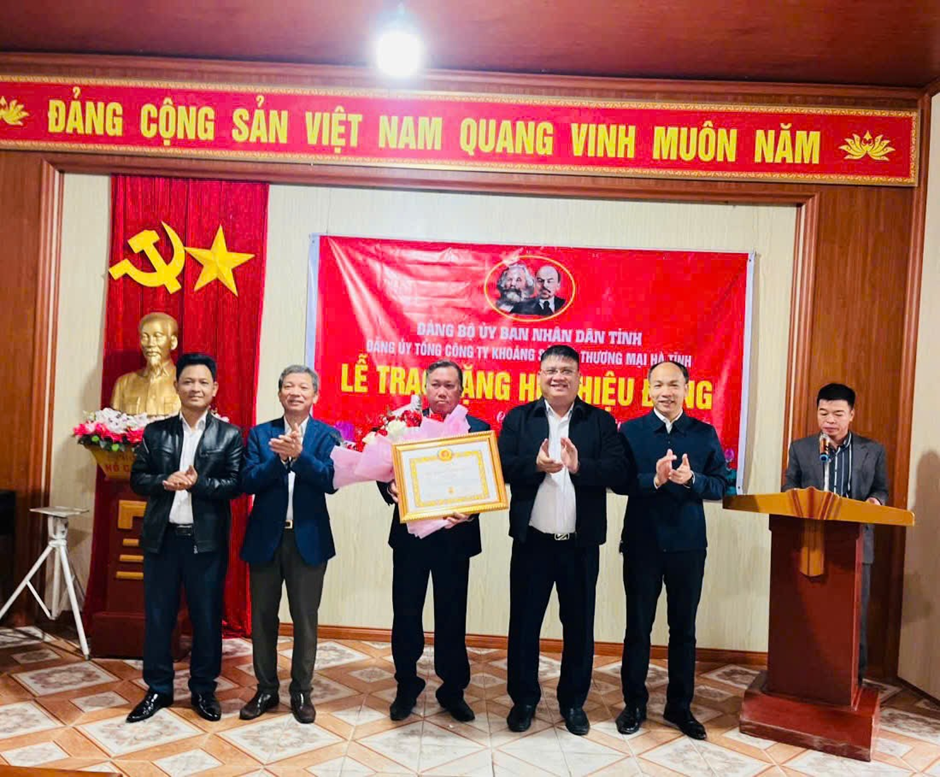 Đồng chí Lê Viết Thảo - Ủy viên BCH Đảng bộ UBND tỉnh, Bí thư Đảng ủy, Tổng Giám đốc Tổng Công ty Khoáng sản và Thương mại Hà Tĩnh trao tặng Huy hiệu 30 năm tuổi Đảng cho đồng chí Nguyễn Sỹ Hựu - Đảng viên Chi bộ Công ty Cổ phần Thức ăn chăn nuôi Thiên Lộc, thuộc Đảng bộ Tổng công ty Khoáng sản và Thương mại Hà Tĩnh.