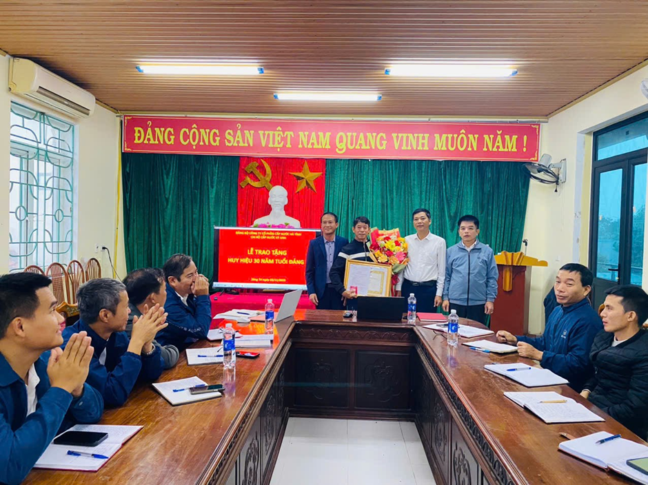Đồng chí Phạm Nam Long - Ủy viên BCH Đảng bộ Công ty Cổ phần Cấp nước Hà Tĩnh, Bí thư chi bộ Chi nhánh Cấp nước Kỳ Anh trao tặng Huy hiệu 30 năm tuổi Đảng cho đồng chí Trần Mạnh Tiến đảng viên Chi bộ.