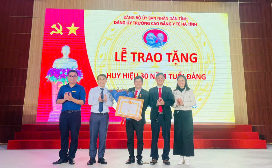 Đồng chí Nguyễn Thanh Lâm - Ủy viên BCH Đảng bộ, Phó Trưởng ban Tuyên giáo và Dân vận Đảng ủy UBND tỉnh cùng các đồng chí trong BCH Đảng bộ Sở Y tế trao tặng Huy hiệu 30 năm tuổi Đảng cho đồng chí Trần Chiến Thắng - Bí thư Đảng ủy, Hiệu trưởng Trường Cao đẳng Y tế Hà Tĩnh