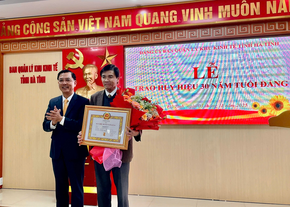 Đồng chí Trần Việt Hà - Ủy viên BTV Tỉnh ủy, Bí thư Đảng ủy, Trưởng BQL Khu kinh tế tỉnh trao tặng Huy hiệu 30 năm tuổi Đảng cho đồng chí Phạm Trần Đệ - Đảng viên Chi bộ Văn phòng - Doanh nghiệp - Đầu tư Đảng bộ Ban Quản lý Khu kinh tế tỉnh