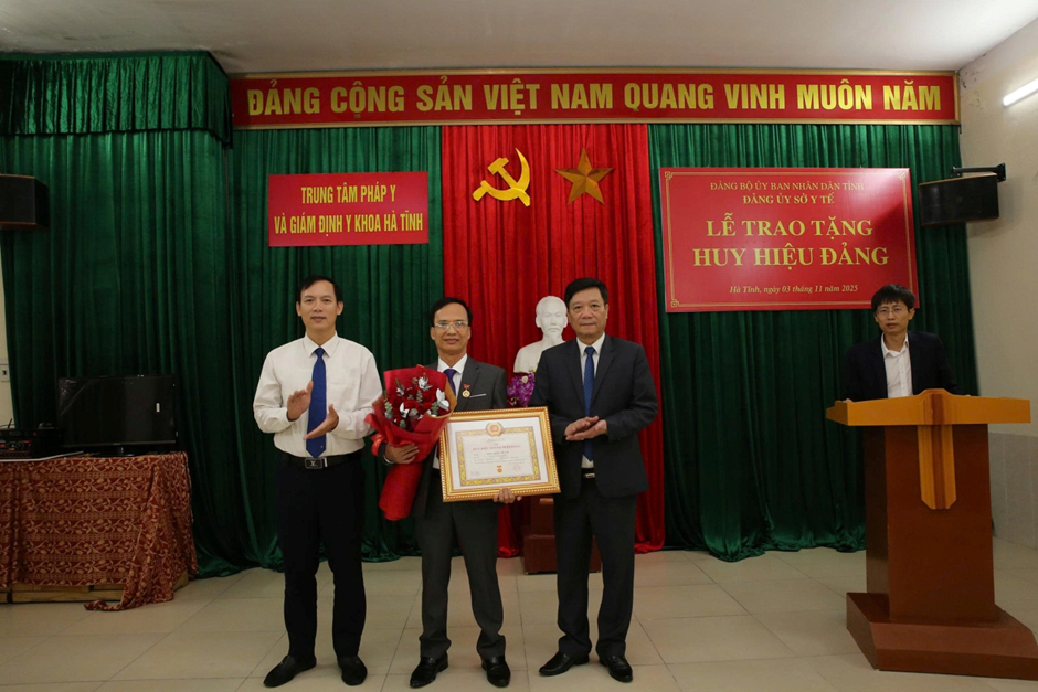 Đồng chí Nguyễn Minh Đức - Tỉnh ủy viên, Bí thư Đảng ủy, Giám đốc Sở Y tế, đại diện Ban Tổ chức Đảng ủy UBND tỉnh trao tặng Huy hiệu 30 năm tuổi Đảng cho đồng chí Đặng Quang Thạch - Đảng viên Chi bộ Trung tâm Pháp Y và Giám định Y khoa Hà Tĩnh thuộc Đảng bộ Sở Y tế