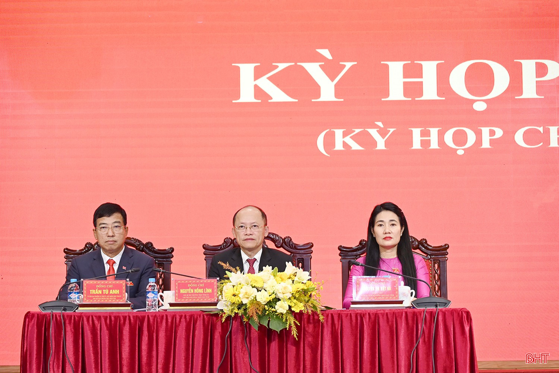 Đồng chí Nguyễn Hồng Lĩnh - Phó Bí thư Thường trực Tỉnh ủy, Chủ tịch HĐND tỉnh và các đồng chí Phó Chủ tịch HĐND tỉnh: Trần Tú Anh, Nguyễn Thị Việt Hà chủ tọa kỳ họp.