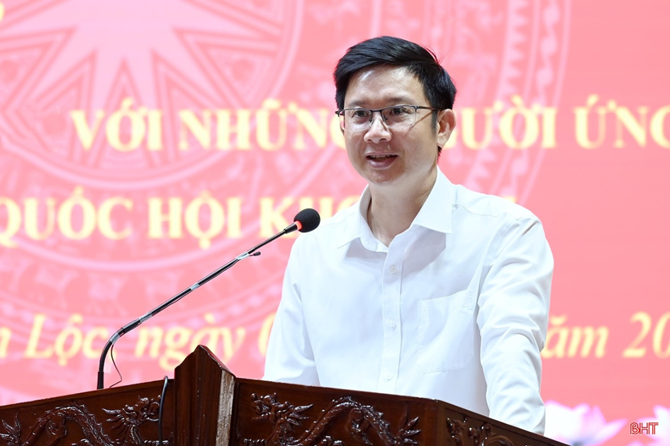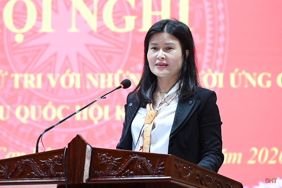 Tại hội nghị, đại biểu và cử tri đã nghe thông qua danh sách, tiểu sử tóm tắt của 5 ứng cử viên ĐBQH khóa XVI tại đơn vị bầu cử đại biểu Quốc hội số 2 (gồm các phường, xã: Thành Sen, Hà Huy Tập, Trần Phú, Thạch Hà, Toàn Lưu, Việt Xuyên, Đông Kinh, Lộc Hà, Mai Phụ, Can Lộc, Xuân Lộc, Gia Hanh, Đồng Lộc, Tùng Lộc, Hồng Lộc, Cổ Đạm, Nghi Xuân, Tiên Điền, Đan Hải).