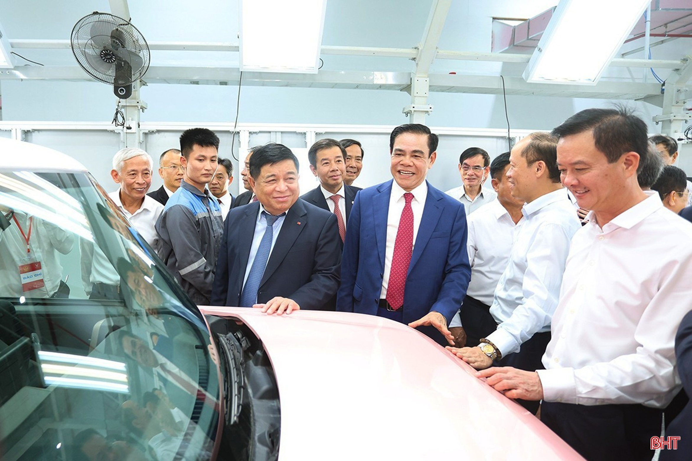 Phó Thủ tướng Chính phủ Nguyễn Chí Dũng, các đồng chí lãnh đạo tỉnh và đại biểu tham quan dây chuyền sản xuất Nhà máy Sản xuất ôtô điện VinFast. Ảnh tư liệu